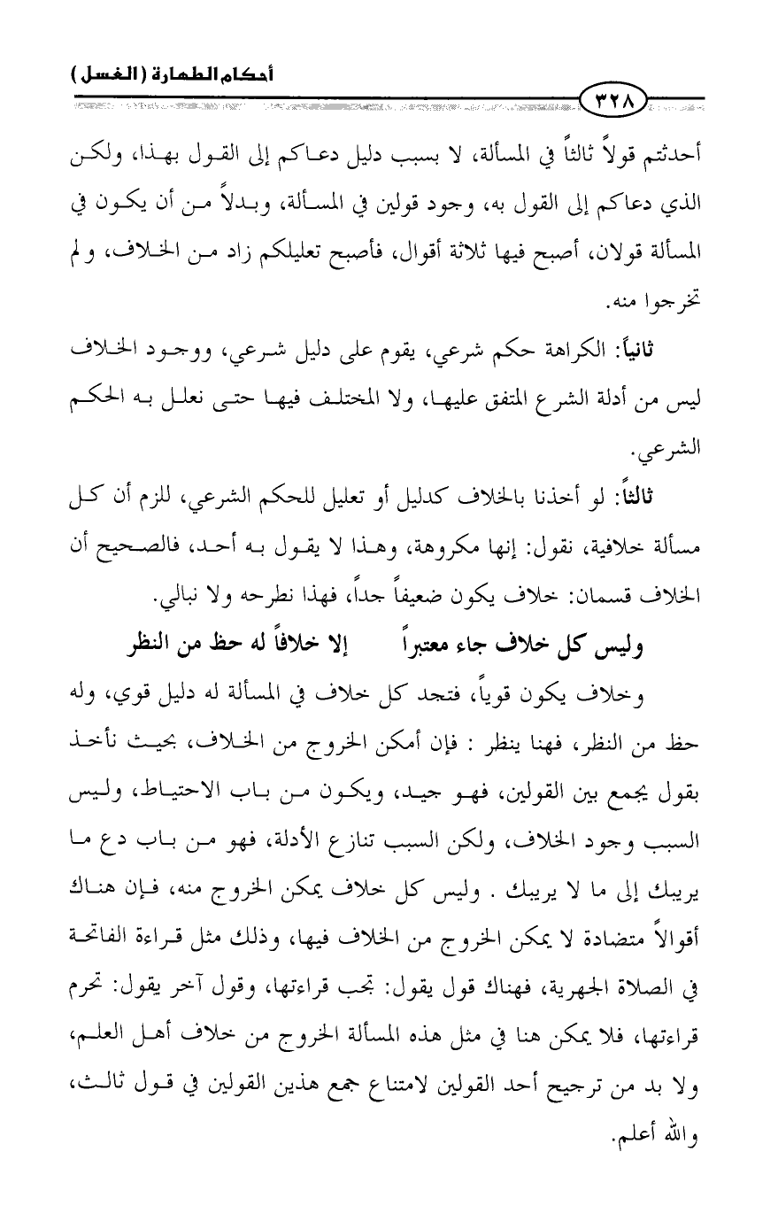 ثالثاً: لو أخذنا بالخلاف كدليل أو تعليل للحكم الشرعي، للزم أن كل مسألة خلافية، نقول: إنها مكروهة، وهذا لا يقول به أحد، فالصحيح أن الخلاف قسمان: خلاف يكون ضعيفاً جداً، فهذا نطرحه ولا نبالي.
