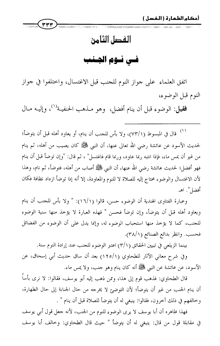 وعبارة الفتاوى الهندية أن الوضوء حسن، قالوا (١/ ١٦): " ولا بأس للجنب أن ينام ويعاود أهله قبل أن يتوضأ، وإن توضأ فحسن " فهذه العبارة لا يؤخذ منها سنية الوضوء للجنب، كما لا يؤخذ منها استحباب الوضوء له، وإنما يدل على أن الوضوء من الفضائل فحسب. وانظر بدائع الصنائع (١/ ٣٨).
