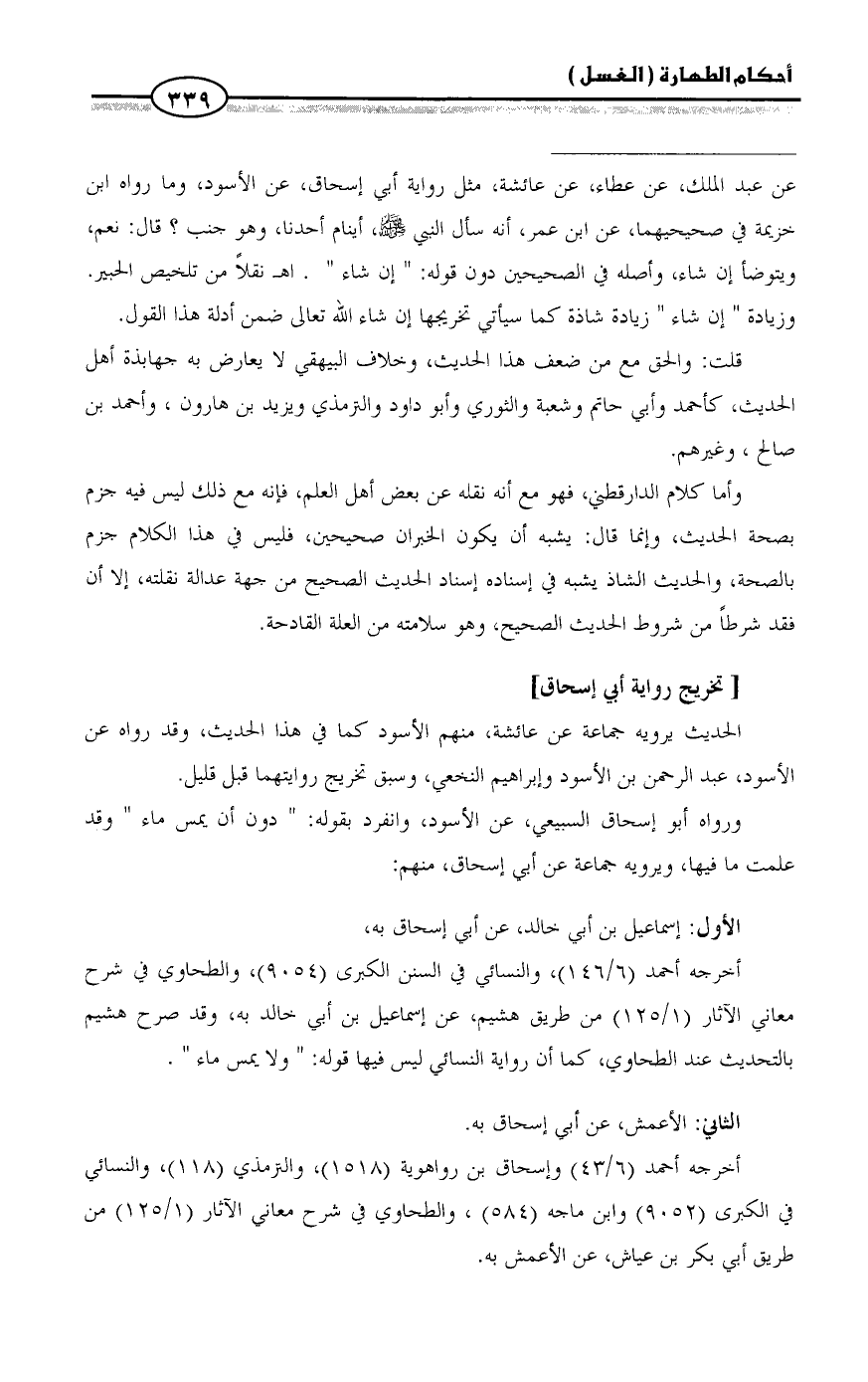 = عن عبد الملك، عن عطاء، عن عائشة، مثل رواية أبي إسحاق، عن الأسود، وما رواه ابن خزيمة في صحيحيهما، عن ابن عمر، أنه سأل النبي - صلى الله عليه وسلم -، أينام أحدنا، وهو جنب؟ قال: نعم، ويتوضأ إن شاء، وأصله في الصحيحين دون قوله: " إن شاء ". اهـ نقلاً من تلخيص الحبير. وزيادة " إن شاء " زيادة شاذة كما سيأتي تخريجها إن شاء الله تعالى ضمن أدلة هذا القول.