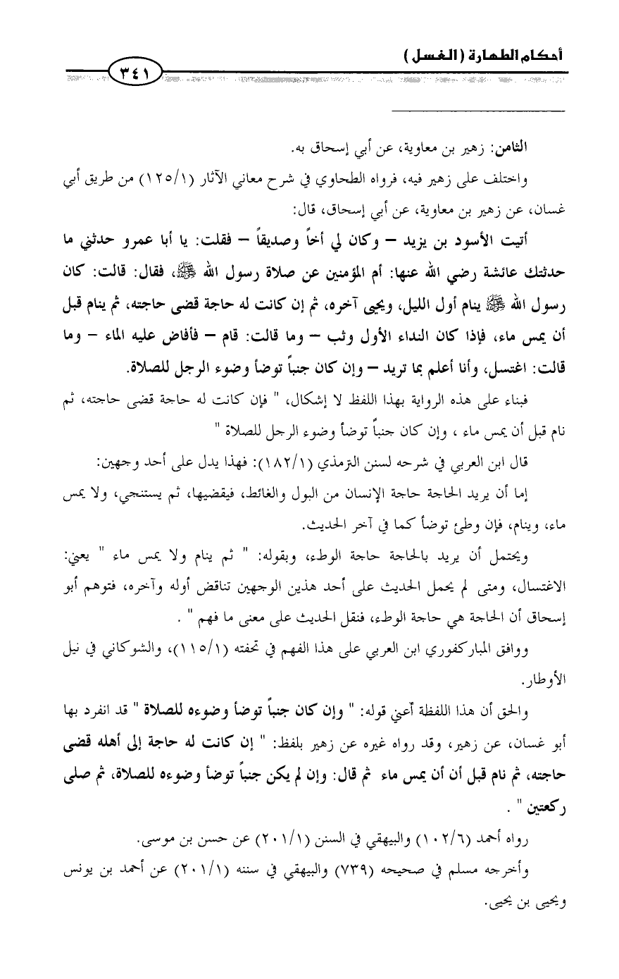 والحق أن هذا اللفظة أعني قوله: " وإن كان جنباً توضأ وضوءه للصلاة " قد انفرد بها أبو غسان، عن زهير، وقد رواه غيره عن زهير بلفظ: " إن كانت له حاجة إلى أهله قضى حاجته، ثم نام قبل أن أن يمس ماء ثم قال: وإن لم يكن جنباً توضأ وضوءه للصلاة، ثم صلى ركعتين ".