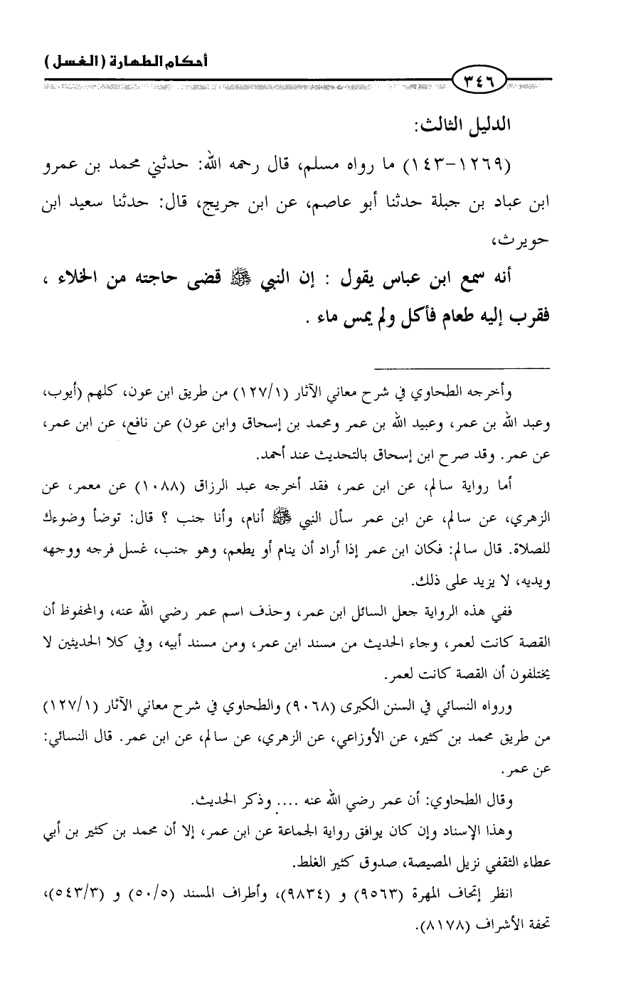 أما رواية سالم، عن ابن عمر، فقد أخرجه عبد الرزاق (١٠٨٨) عن معمر، عن الزهري، عن سالم، عن ابن عمر سأل النبي - صلى الله عليه وسلم - أنام، وأنا جنب؟ قال: توضأ وضوءك للصلاة. قال سالم: فكان ابن عمر إذا أراد أن ينام أو يطعم، وهو جنب، غسل فرجه ووجهه ويديه، لا يزيد على ذلك.