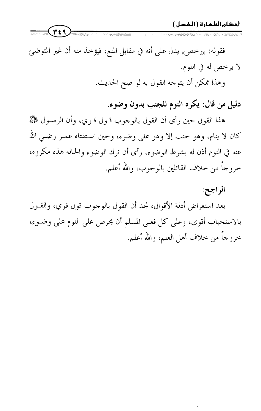 هذا القول حين رأى أن القول بالوجوب قول قوي، وأن الرسول - صلى الله عليه وسلم - كان لا ينام، وهو جنب إلا وهو على وضوء، وحين استفتاه عمر رضي الله عنه في النوم أذن له بشرط الوضوء، رأى أن ترك الوضوء والحالة هذه مكروه، خروجاً من خلاف القائلين بالوجوب، والله أعلم.