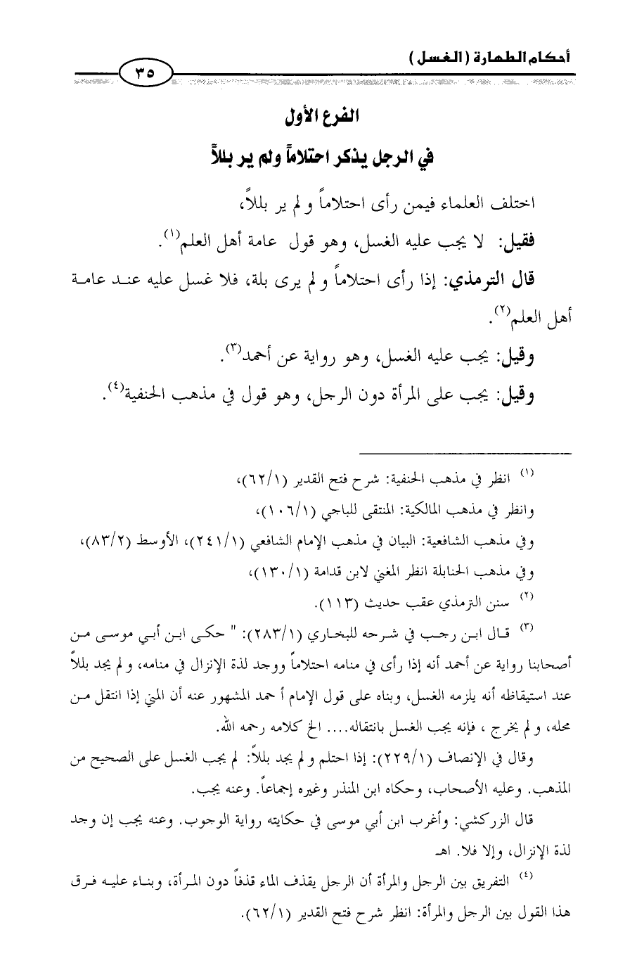 (¬٣) قال ابن رجب في شرحه للبخاري (١/ ٢٨٣): " حكى ابن أبي موسى من أصحابنا رواية عن أحمد أنه إذا رأى في منامه احتلاماً ووجد لذة الإنزال في منامه، ولم يجد بللاً عند استيقاضه أنه يلزمه الغسل، وبناه على قول الإمام أحمد المشهور عنه أن المني إذا انتقل من محله، ولم يخرج، فإنه يجب الغسل بانتقاله .... الخ كلامه رحمه الله.