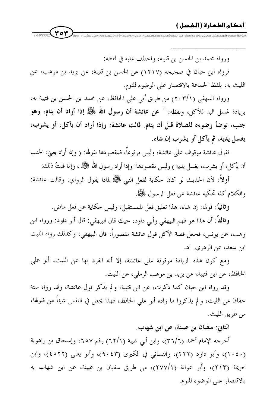 فقول عائشة موقوف على عائشة، وليس مرفوعاً، فمقصودها بقولها: (وإذا أراد يعني: الجنب أن يأكل، أو يشرب، يغسل يديه) وليس مقصودها: وإذا أراد رسول الله - صلى الله عليه وسلم -، وإنما قلتُ ذلك: