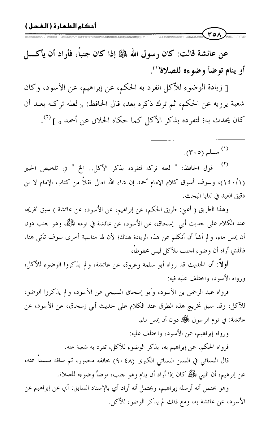 وهذا الطريق (أعني: طريق الحكم، عن إبراهيم، عن الأسود، عن عائشة) سبق تخريجه عند الكلام على حديث أبي إسحاق، عن الأسود، عن عائشة في نومه - صلى الله عليه وسلم -، وهو جنب دون أن يمس ماء، ولم أشأ أن أتكلم عن هذه الزيادة هناك؛ لأن لها مناسبة أخرى سوف تأتي هنا، فالذي أراه أن وضوء الجنب للأكل ليس محفوظاً،