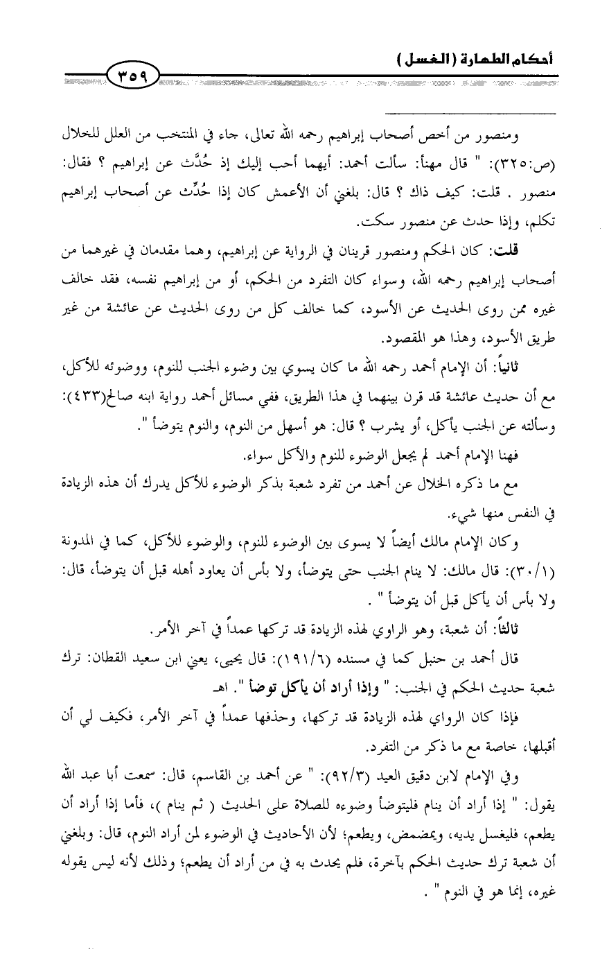 وفي الإمام لابن دقيق العيد (٣/ ٩٢): " عن أحمد بن القاسم، قال: سمعت أبا عبد الله يقول: " إذا أراد أن ينام فليتوضأ وضوءه للصلاة على الحديث (ثم ينام)، فأما إذا أراد أن يطعم، فليغسل يديه، ويمضمض، ويطعم؛ لأن الأحاديث في الوضوء لمن أراد النوم، قال: وبلغني أن شعبة ترك حديث الحكم بآخرة، فلم يحدث به في من أراد أن يطعم؛ وذلك لأنه ليس يقوله غيره، إنما هو في النوم ". =