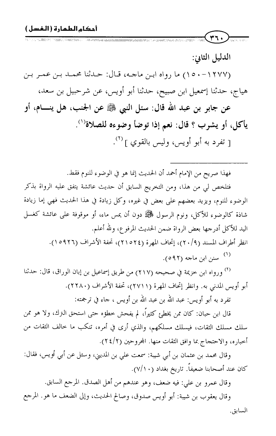 فتلخص لي من هذا، ومن التخريج السابق أن حديث عائشة يتفق عليه الرواة بذكر الوضوء للنوم، ويزيد بعضهم على بعض في غيره، وكل زيادة في هذا الحديث فهي إما زيادة شاذة كالوضوء للأكل، ونوم الرسول - صلى الله عليه وسلم - دون أن يمس ماء، أو موقوفة على عائشة كغسل اليد للأكل أدرجها بعض الرواة ضمن الحديث المرفوع، ولله أعلم.