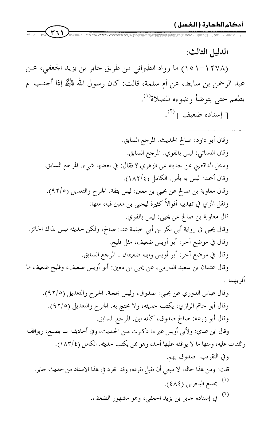 (١٢٧٨ - ١٥١) ما رواه الطبراني من طريق جابر بن يزيد الجعفي، عن عبد الرحمن بن سابط، عن أم سلمة، قالت: كان رسول الله - صلى الله عليه وسلم - إذا أجنب لم يطعم حتى يتوضأ وضوءه للصلاة (¬١).