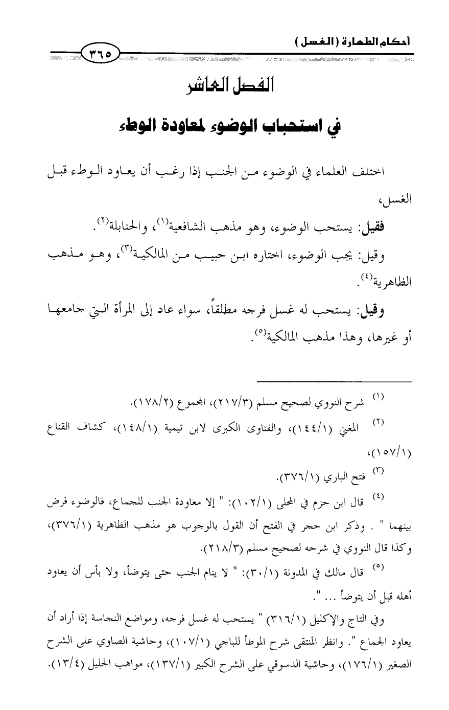 (¬٤) قال ابن حزم في المحلى (١/ ١٠٢): " إلا معاودة الجنب للجماع، فالوضوء فرض بينهما ". وذكر ابن حجر في الفتح أن القول بالوجوب هو مذهب الظاهرية (١/ ٣٧٦)، وكذا قال النووي في شرحه لصحيح مسلم (٣/ ٢١٨).