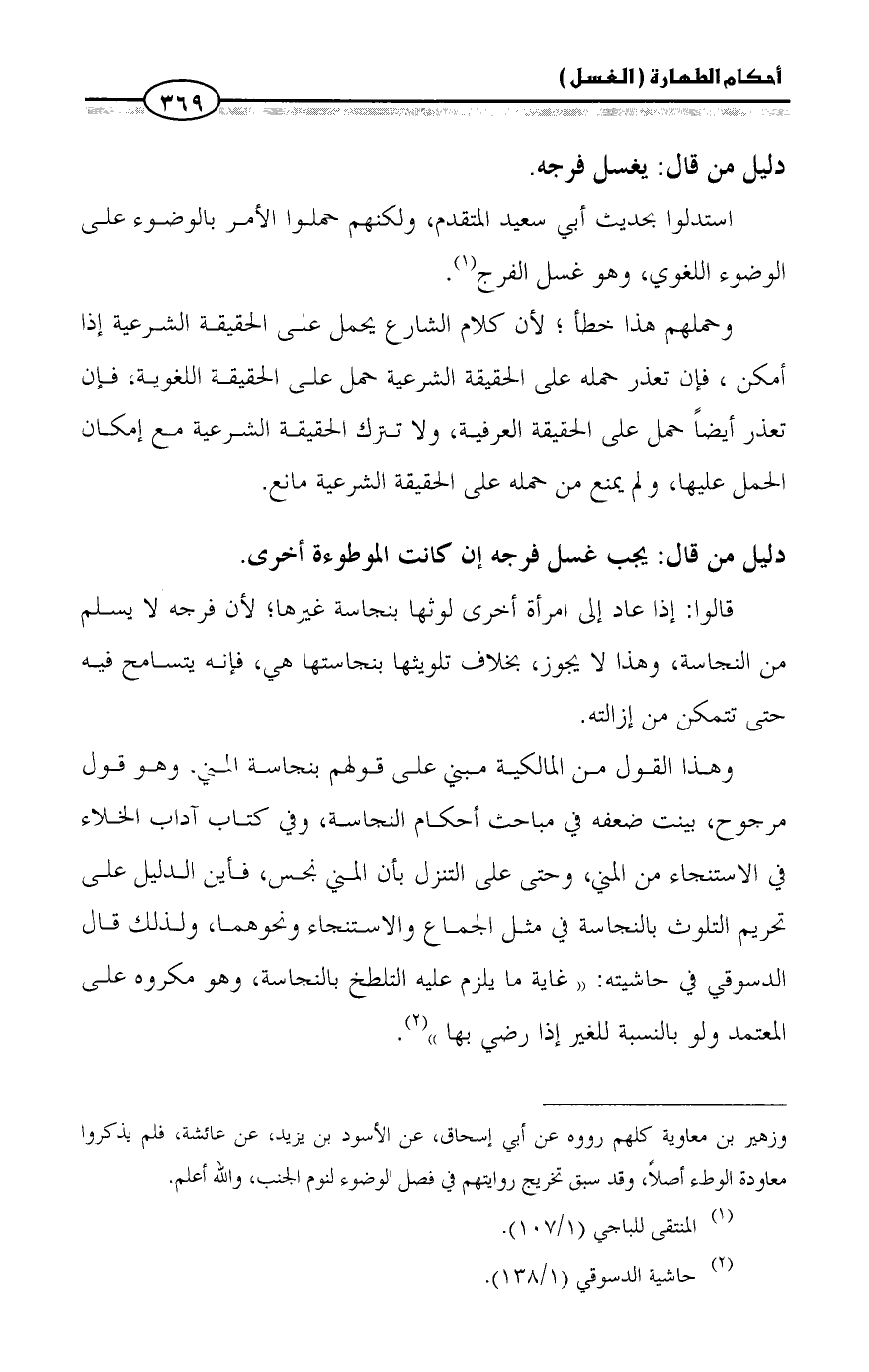 وهذا القول من المالكية مبني على قولهم بنجاسة المني، وهو قول مرجوح، بينت ضعفه في مباحث أحكام النجاسة، وفي كتاب آداب الخلاء في الاستنجاء من المني، وحتى على التنزل بأن المني نجس، فأين الدليل على تحريم التلوث بالنجاسة في مثل الجماع والاستنجاء ونحوهما، ولذلك قال الدسوقي في حاشيته: «غاية ما يلزم عليه التلطخ بالنجاسة، وهو مكروه على المعتمد ولو بالنسبة للغير إذا رضي بها» (¬٢).