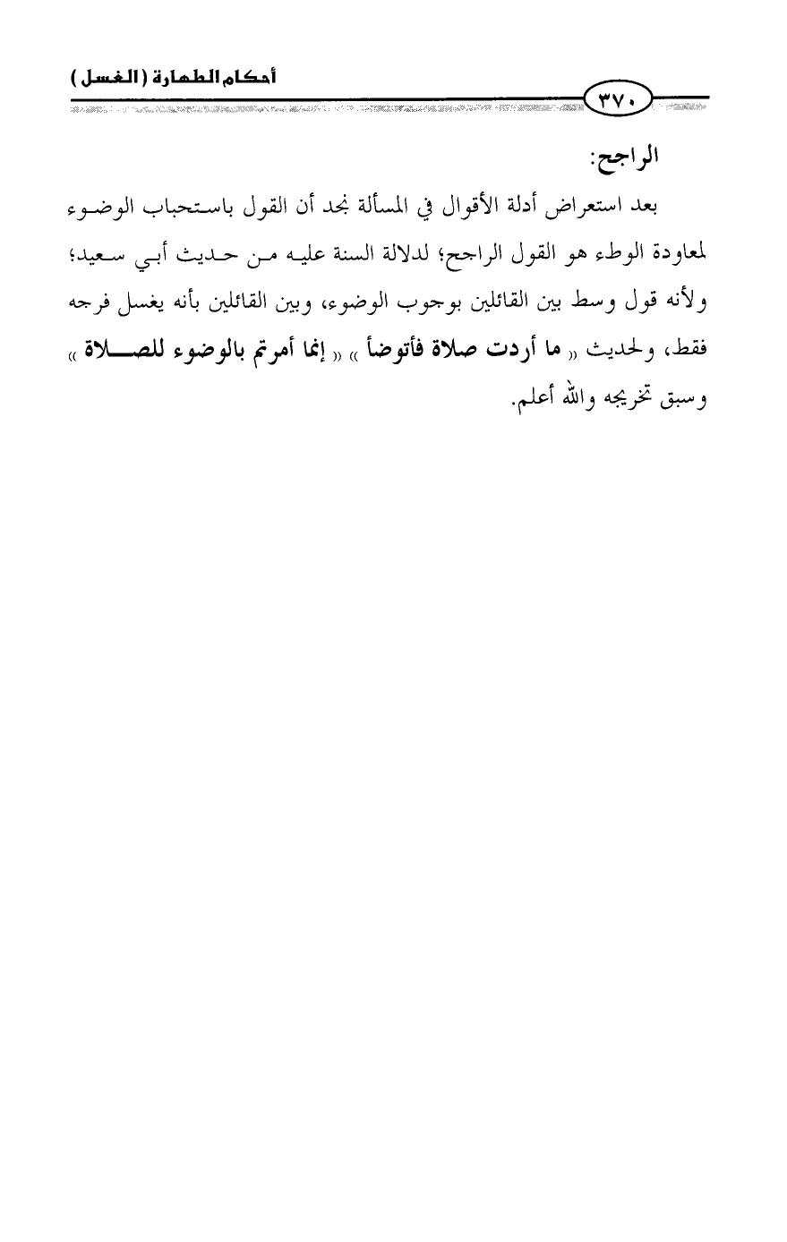بعد استعراض أدلة الأقوال في المسألة نجد أن القول باستحباب الوضوء لمعاودة الوطء هو القول الراجح؛ لدلالة السنة عليه من حديث أبي سعيد؛ ولأنه قول وسط بين القائلين بوجوب الوضوء، وبين القائلين بأنه يغسل فرجه فقط، ولحديث «ما أردت صلاة فأتوضأ» «إنما أمرتم بالوضوء للصلاة» وسبق تخريجه والله أعلم.