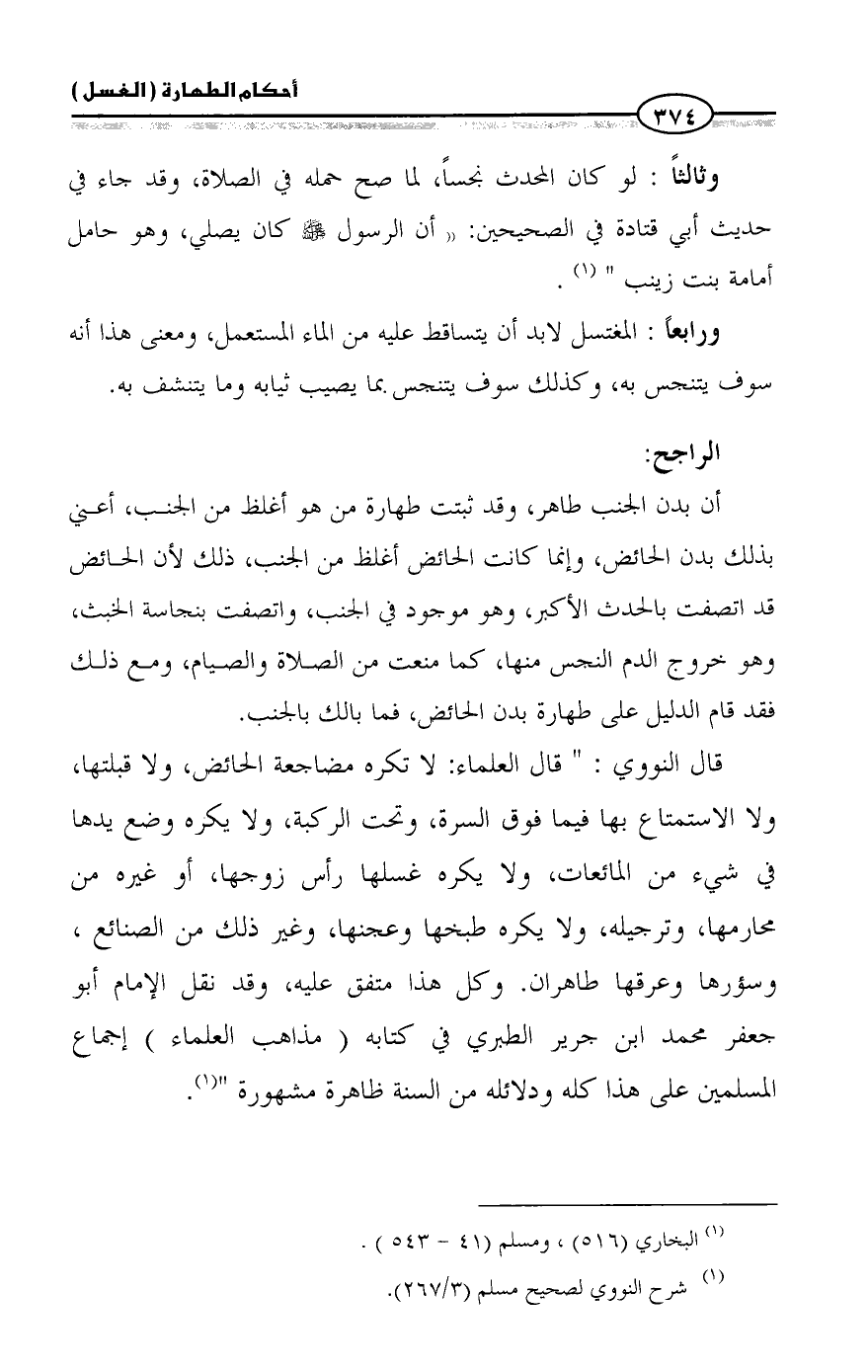 وثالثاً: لو كان المحدث نجساً، لما صح حمله فى الصلاة، وقد جاء في حديث أبي قتادة في الصحيحين: «أن الرسول - صلى الله عليه وسلم - كان يصلي، وهو حامل أمامة بنت زينب» (¬١).