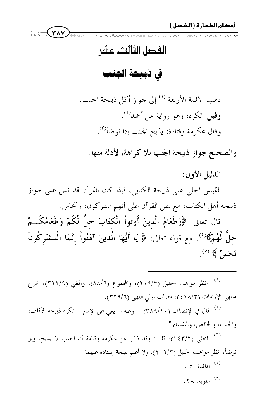 (¬٣) المحلى (٦/ ١٤٣)، قلت: وقد ذكر عن عكرمة وقتادة أن الجنب لا يذبح، ولو توضأ، انظر مواهب الجليل (٣/ ٢٠٩)، ولا أعلم صحة إسناده عنهما.