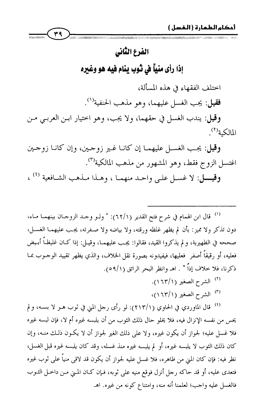 (¬١) قال ابن الهمام في شرح فتح القدير (١/ ٦٢): " ولو وجد الزوجان بينهما ماء، دون تذكر ولا مميز: بأن لم يظهر غلظه ورقته، ولا بياضه ولا صفرته، يجب عليهما الغسل، صححه في الظهيرية، ولم يذكروا القيد، فقالوا: يجب عليهما، وقيل: إذا كان غليظاً أبيض فعليه، أو رقيقاً أصفر فعليها، فيفيدونه بصورة نقل الخلاف، والذي يظهر تقييد الوجوب بما ذكرنا، فلا خلاف إذاً ". اهـ وانظر البحر الرائق (١/ ٥٩).