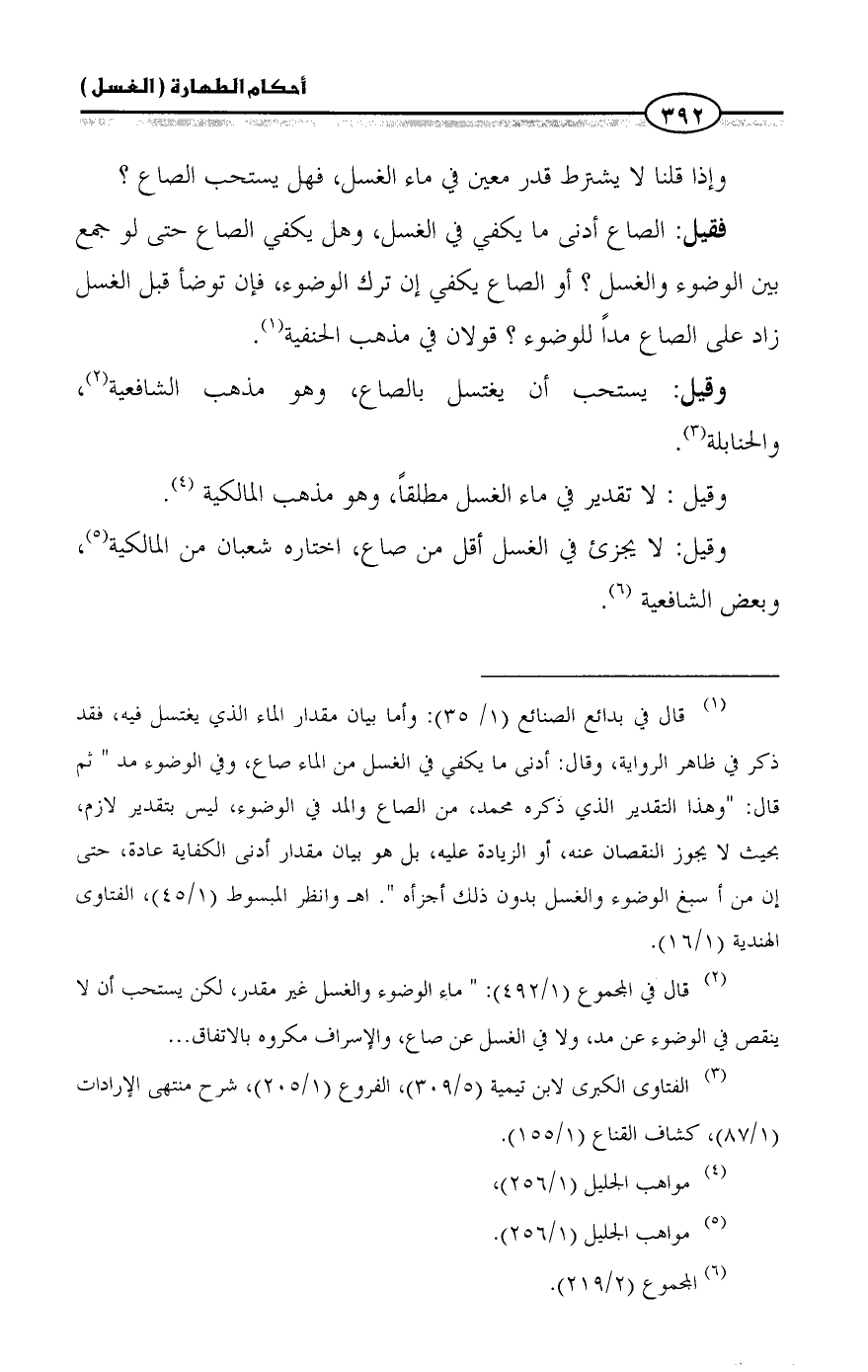 (¬١) قال في بدائع الصنائع (١/ ٣٥): وأما بيان مقدار الماء الذي يغتسل فيه، فقد ذكر في ظاهر الرواية، وقال: أدنى ما يكفي في الغسل من الماء صاع، وفي الوضوء مد " ثم قال: "وهذا التقدير الذي ذكره محمد، من الصاع والمد في الوضوء، ليس بتقدير لازم، بحيث لا يجوز النقصان عنه، أو الزيادة عليه، بل هو بيان مقدار أدنى الكفاية عادة، حتى إن من أسبغ الوضوء والغسل بدون ذلك أجزأه ". اهـ وانظر المبسوط (١/ ٤٥)، الفتاوى الهندية (١/ ١٦)