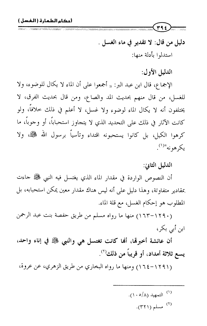 الإجماع، قال ابن عبد البر: «أجمعوا على أن الماء لا يكال للوضوء، ولا للغسل، من قال منهم بحديث المد والصاع، ومن قال بحديث الفرق، لا يختلفون أنه لا يكال الماء لوضوء ولا غسل، لا أعلم في ذلك خلافاً، ولو كانت الآثار في ذلك على التحديد الذي لا يتجاوز استحباباً، أو وجوباً، ما كرهوا الكيل، بل كانوا يستحبونه اقتداء وتأسياً برسول الله - صلى الله عليه وسلم -، ولا يكرهونه» (¬١).