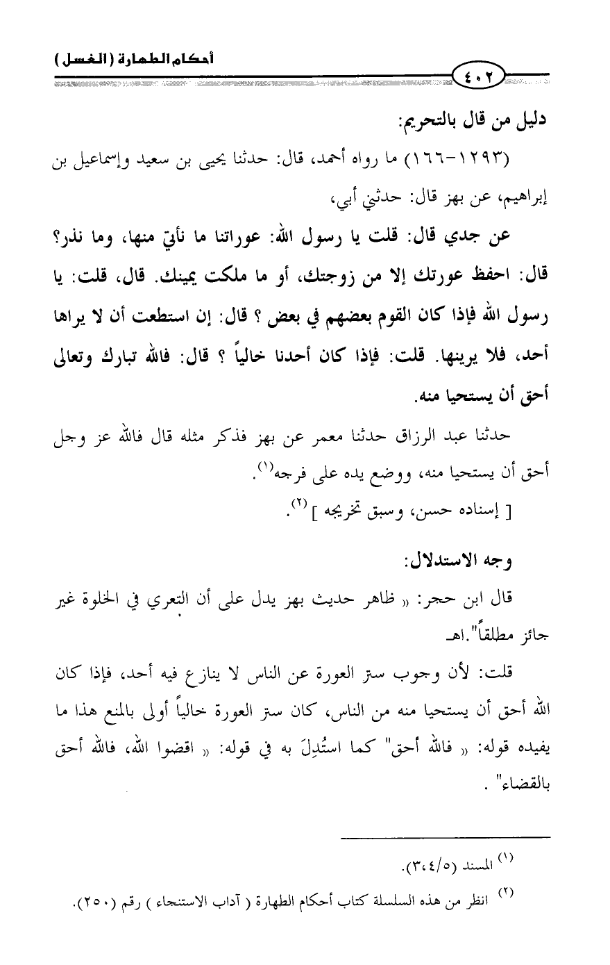 قال ابن حجر: «ظاهر حديث بهز يدل على أن التعري في الخلوة غير جائز مطلقاً». اهـ