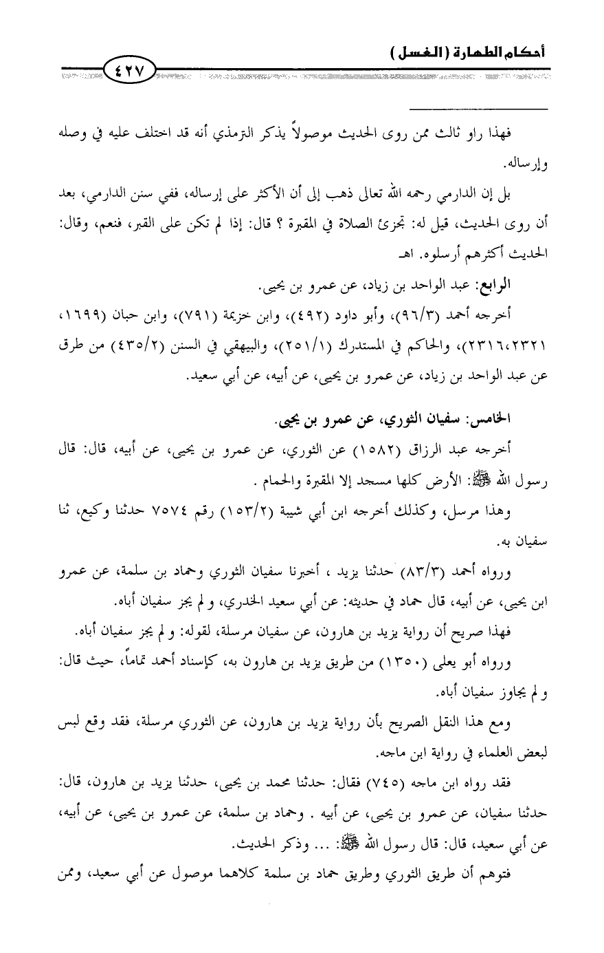 فقد رواه ابن ماجه (٧٤٥) فقال: حدثنا محمد بن يحيى، حدثنا يزيد بن هارون، قال: حدثنا سفيان، عن عمرو بن يحيى، عن أبيه. وحماد بن سلمة، عن عمرو بن يحيى، عن أبيه، عن أبي سعيد، قال: قال رسول الله - صلى الله عليه وسلم -: ... وذكر الحديث.