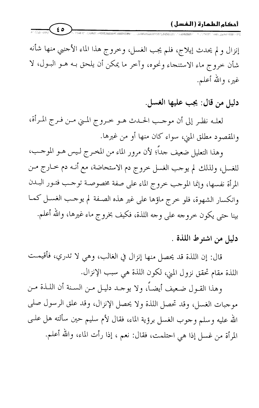 وهذا القول ضعيف أيضاً، ولا يوجد دليل من السنة أن اللذة من موجبات الغسل، وقد تحصل اللذة ولا يحصل الإنزال، وقد علق الرسول صلى الله عليه وسلم وجوب الغسل برؤية الماء، فقال لأم سليم حين سألته هل على المرأة من غسل إذا هي احتلمت، فقال: نعم، إذا رأت الماء، والله أعلم.