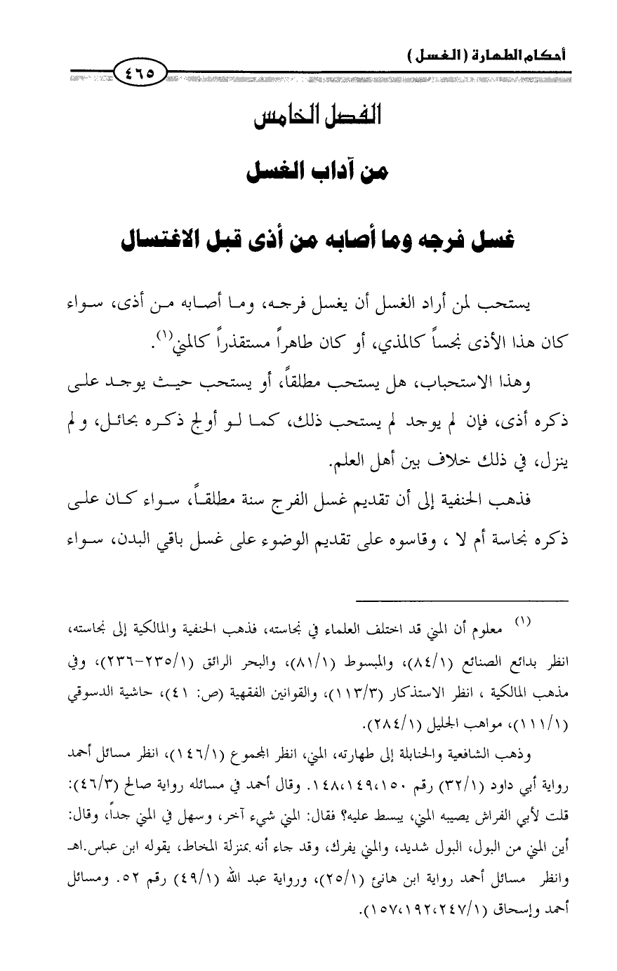 (¬١) معلوم أن المني قد اختلف العلماء في نجاسته، فذهب الحنفية والمالكية إلى نجاسته، انظر بدائع الصنائع (١/ ٨٤)، والمبسوط (١/ ٨١)، والبحر الرائق (١/ ٢٣٥ - ٢٣٦)، وفي مذهب المالكية، انظر الاستذكار (٣/ ١١٣)، والقوانين الفقهية (ص: ٤١)، حاشية الدسوقي (١/ ١١١)، مواهب الجليل (١/ ٢٨٤).