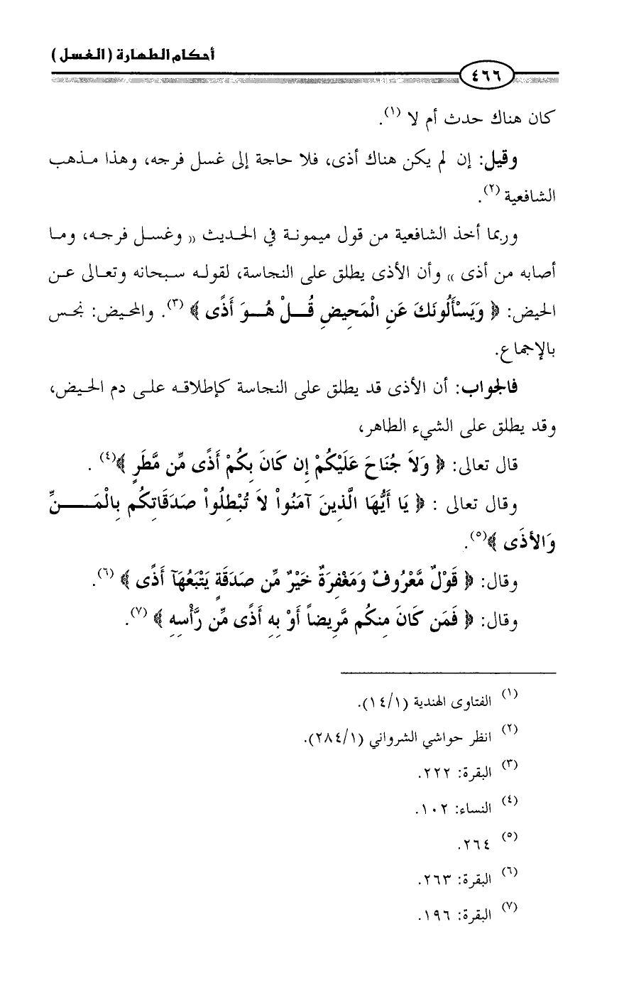 وربما أخذ الشافعية من قول ميمونة في الحديث «وغسل فرجه، وما أصابه من أذى» وأن الأذى يطلق على النجاسة، لقوله سبحانه وتعالى عن الحيض: {يسألونك عن المحيض قل هو أذى} (¬٣). والمحيض: نجس بالإجماع.