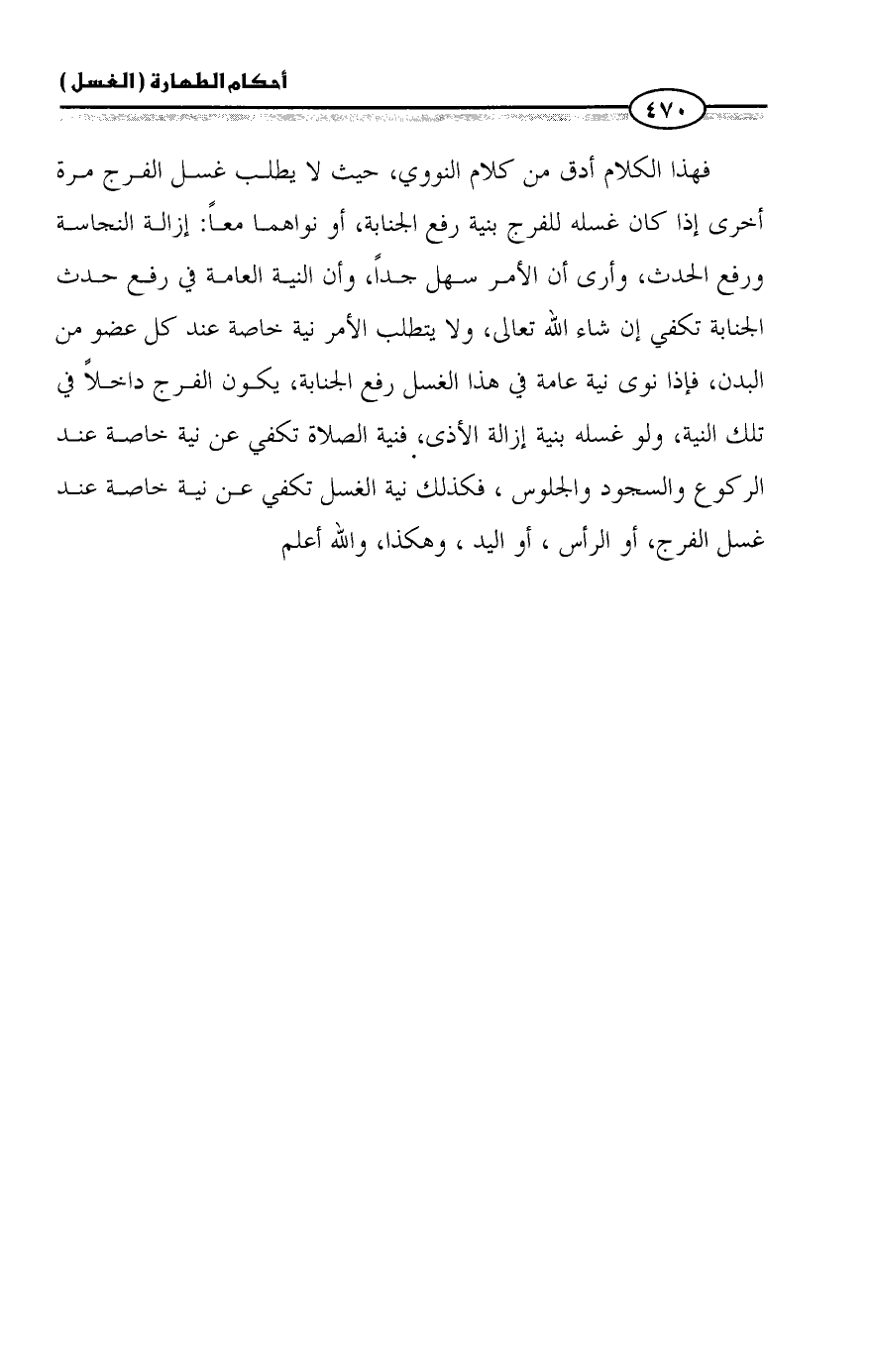 فهذا الكلام أدق من كلام النووي، حيث لا يطلب غسل الفرج مرة أخرى إذا كان غسله للفرج بنية رفع الجنابة، أو نواهما معاً: إزالة النجاسة ورفع الحدث، وأرى أن الأمر سهل جداً، وأن النية العامة في رفع حدث الجنابة تكفي إن شاء الله تعالى، ولا يتطلب الأمر نية خاصة عند كل عضو من البدن، فإذا نوى نية عامة في هذا الغسل رفع الجنابة، يكون الفرج داخلاً في تلك النية، ولو غسله بنية إزالة الأذى، فنية الصلاة تكفي عن نية خاصة عند الركوع والسجود والجلوس، فكذلك نية الغسل تكفي عن نية خاصة عند غسل الفرج، أو الرأس، أو اليد، وهكذا، والله أعلم