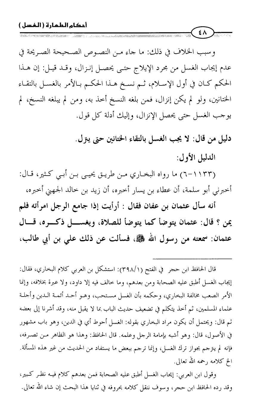 وقول ابن العربي: إيحاب الغسل أطبق عليه الصحابة فمن بعدهم كلام فيه نظر كبير، وقد رده الحافظ ابن حجر، وسوف ننقل كلامه بحروفه في ثنايا هذا البحث إن شاء الله تعالى.