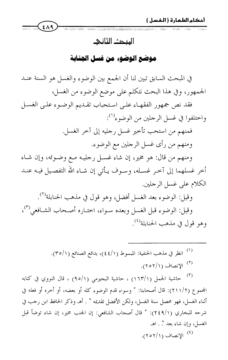 في المبحث السابق تبين لنا أن الجمع بين الوضوء والغسل هو السنة عند الجمهور، وفي هذا البحث نتكلم على موضع الوضوء من الغسل،