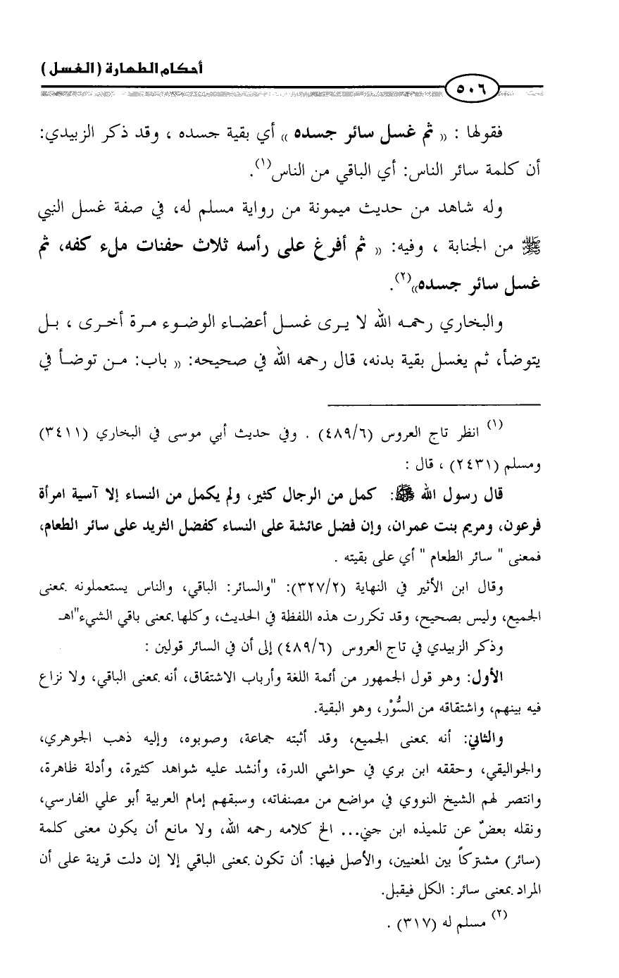والثاني: أنه بمعنى الجميع، وقد أثبته جماعة، وصوبوه، وإليه ذهب الجوهري، والجواليقي، وحققه ابن بري في حواشي الدرة، وأنشد عليه شواهد كثيرة، وأدلة ظاهرة، وانتصر لهم الشيخ النووي في مواضع من مصنفاته، وسبقهم إمام العربية أبو علي الفارسي، ونقله بعضٌ عن تلميذه ابن جني ... الخ كلامه رحمه الله، ولا مانع أن يكون معنى كلمة (سائر) مشتركاً بين المعنيين، والأصل فيها: أن تكون بمعنى الباقي إلا إن دلت قرينة على أن المراد بمعنى سائر: الكل فيقبل.