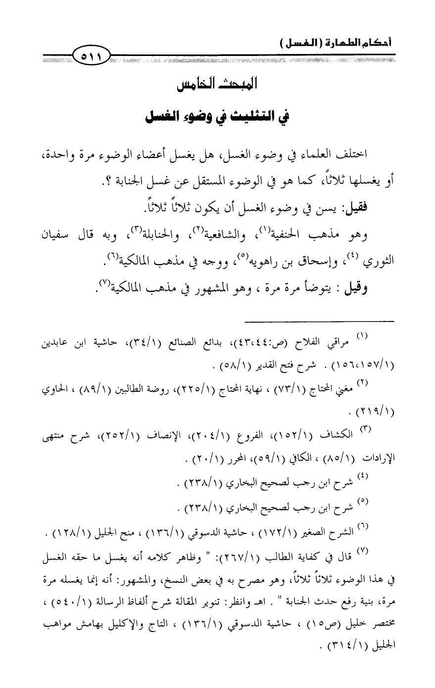 (¬٧) قال في كفاية الطالب (١/ ٢٦٧): " وظاهر كلامه أنه يغسل ما حقه الغسل في هذا الوضوء ثلاثاً ثلاثاً، وهو مصرح به في بعض النسخ، والمشهور: أنه إنما يغسله مرة مرة، بنية رفع حدث الجنابة ". اهـ وانظر: تنوير المقالة شرح ألفاظ الرسالة (١/ ٥٤٠)، مختصر خليل (ص ١٥)، حاشية الدسوقي (١/ ١٣٦)، التاج والإكليل بهامش مواهب الجليل (١/ ٣١٤).