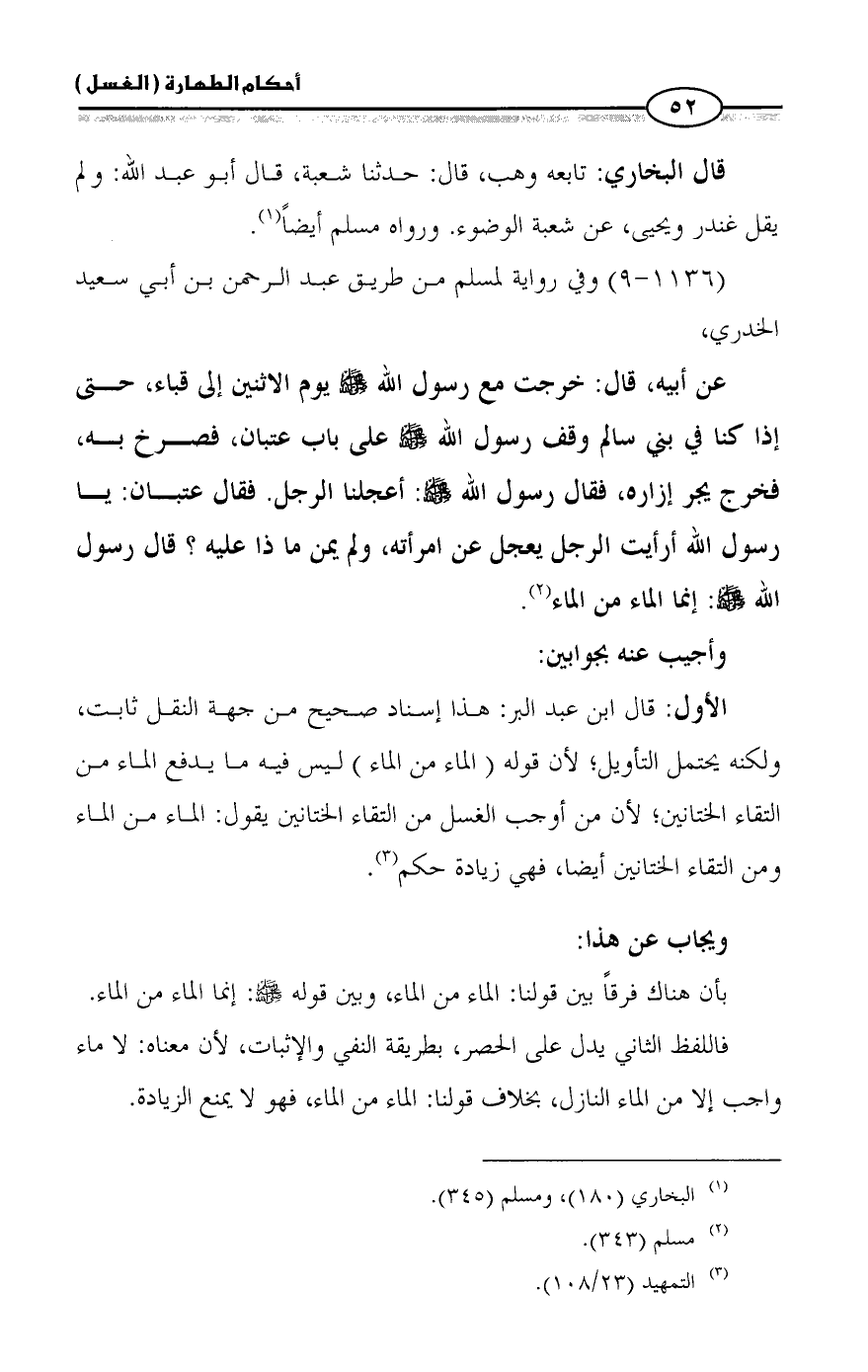 الأول: قال ابن عبد البر: هذا إسناد صحيح من جهة النقل ثابت، ولكنه يحتمل التأويل؛ لأن قوله (الماء من الماء) ليس فيه ما يدفع الماء من التقاء الختانين؛ لأن من أوجب الغسل من التقاء الختانين يقول: الماء من الماء ومن التقاء الختانين أيضا، فهي زيادة حكم (¬٣).