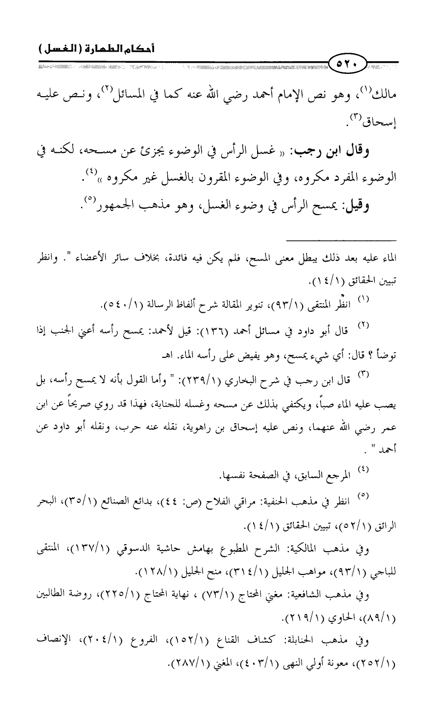 (¬٢) قال أبو داود في مسائل أحمد (١٣٦): قيل لأحمد: يمسح رأسه أعني الجنب إذا توضأ؟ قال: أي شيء يمسح، وهو يفيض على رأسه الماء. اهـ