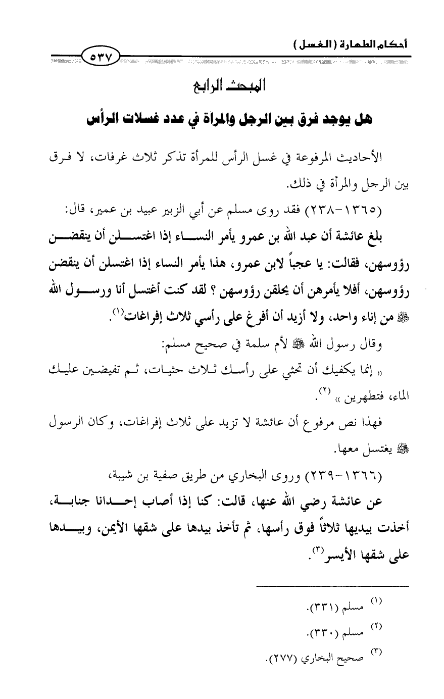عن عائشة رضي الله عنها، قالت: كنا إذا أصاب إحدانا جنابة، أخذت بيديها ثلاثاً فوق رأسها، ثم تأخذ بيدها على شقها الأيمن، وبيدها على شقها الأيسر (¬٣).