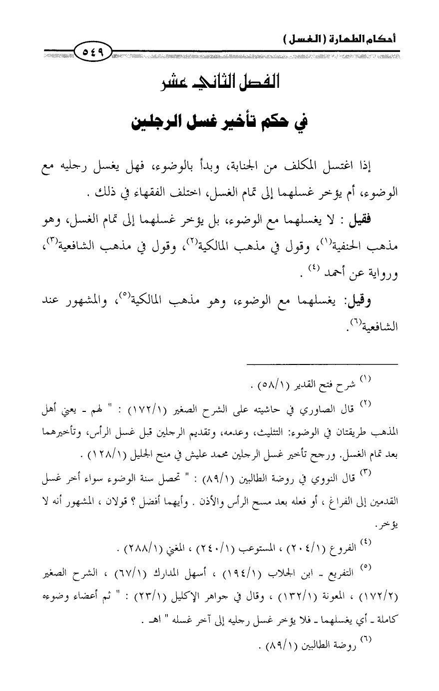 (¬٢) قال الصاوري في حاشيته على الشرح الصغير (١/ ١٧٢): " لهم ـ يعني أهل المذهب طريقتان في الوضوء: التثليث، وعدمه، وتقديم الرجلين قبل غسل الرأس، وتأخيرهما بعد تمام الغسل. ورجح تأخير غسل الرجلين محمد عليش في منح الجليل (١/ ١٢٨).