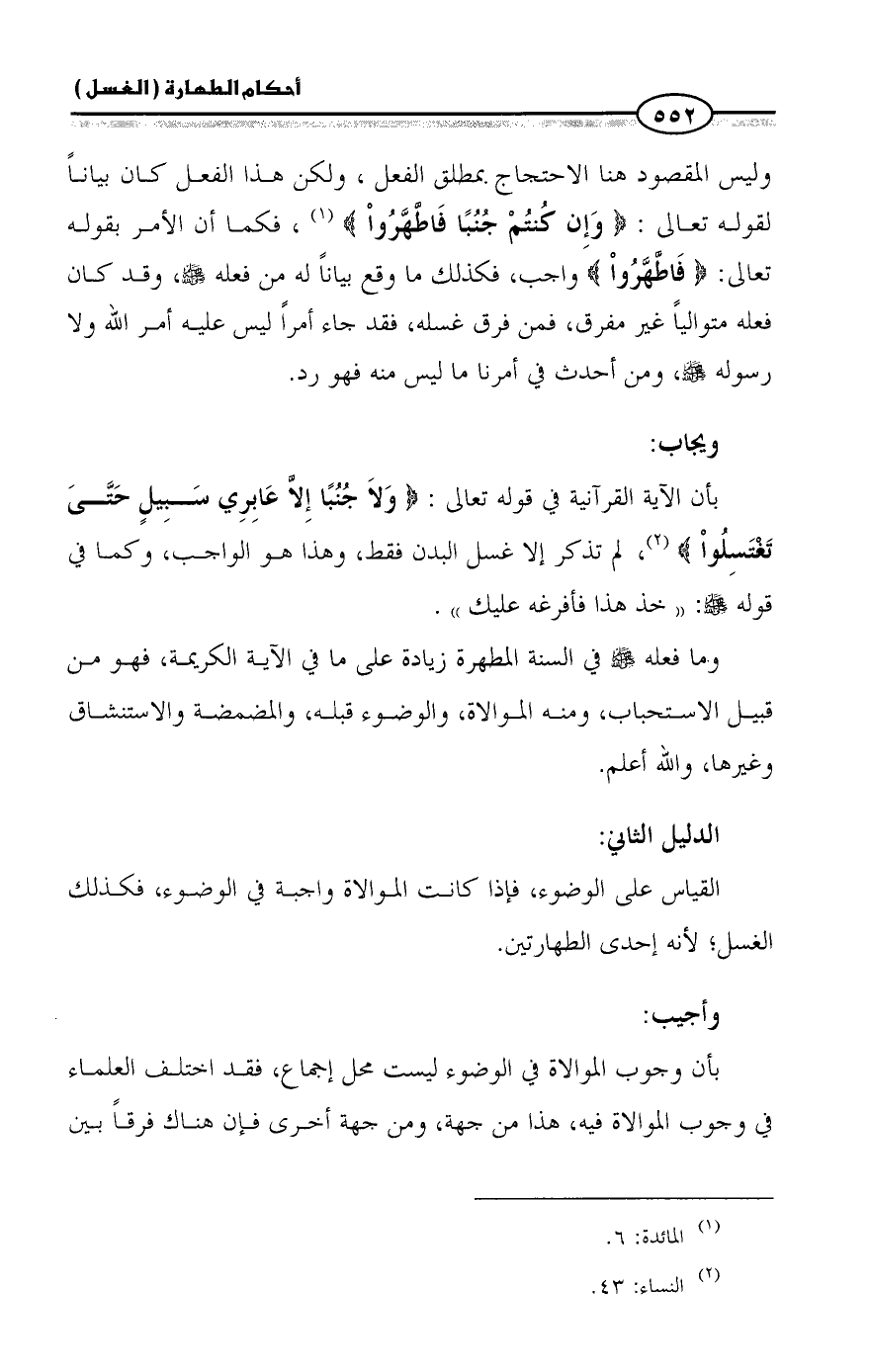 بأن الآية القرآنية في قوله تعالى: {ولا جنباً إلا عابري سبيل حتى تغتسلوا} (¬٢)، لم تذكر إلا غسل البدن فقط، وهذا هو الواجب، وكما في قوله - صلى الله عليه وسلم -: «خذ هذا فأفرغه عليك».
