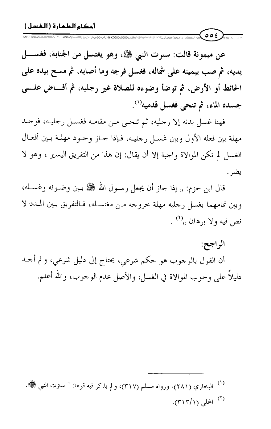 قال ابن حزم: «إذا جاز أن يجعل رسول الله - صلى الله عليه وسلم - بين وضوئه وغسله، وبين تمامهما بغسل رجليه مهلة خروجه من مغتسله، فالتفريق بين المدد لا نص فيه ولا برهان» (¬٢).