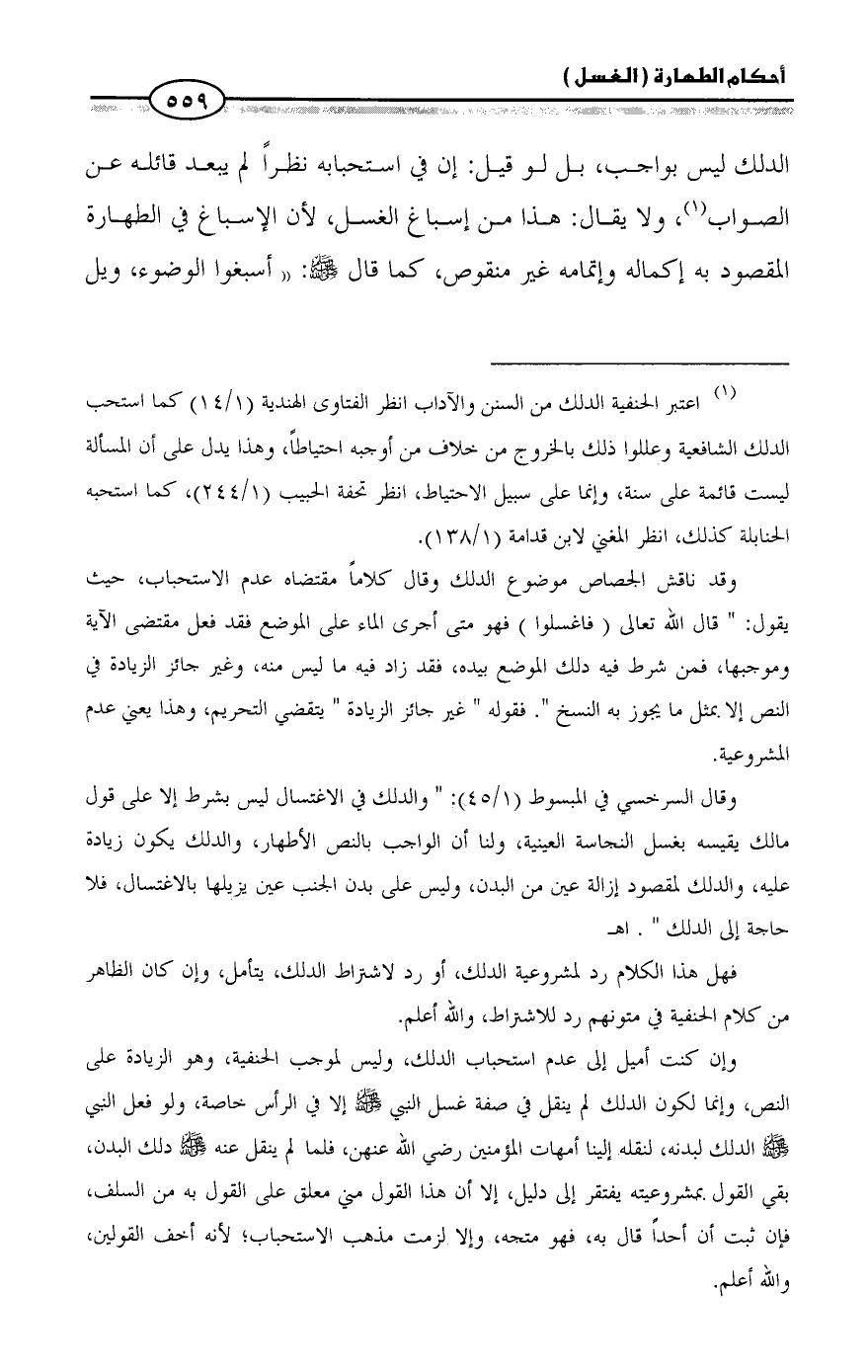 وإن كنت أميل إلى عدم استحباب الدلك، وليس لموجب الحنفية، وهو الزيادة على النص، وإنما لكون الدلك لم ينقل في صفة غسل النبي - صلى الله عليه وسلم - إلا في الرأس خاصة، ولو فعل النبي - صلى الله عليه وسلم - الدلك لبدنه، لنقله إلينا أمهات المؤمنين رضي الله عنهن، فلما لم ينقل عنه - صلى الله عليه وسلم - دلك البدن، بقي القول بمشروعيته يفتقر إلى دليل، إلا أن هذا القول مني معلق على القول به من السلف، فإن ثبت أن أحداً قال به، فهو متجه، وإلا لزمت مذهب الاستحباب؛ لأنه أخف القولين، والله أعلم.