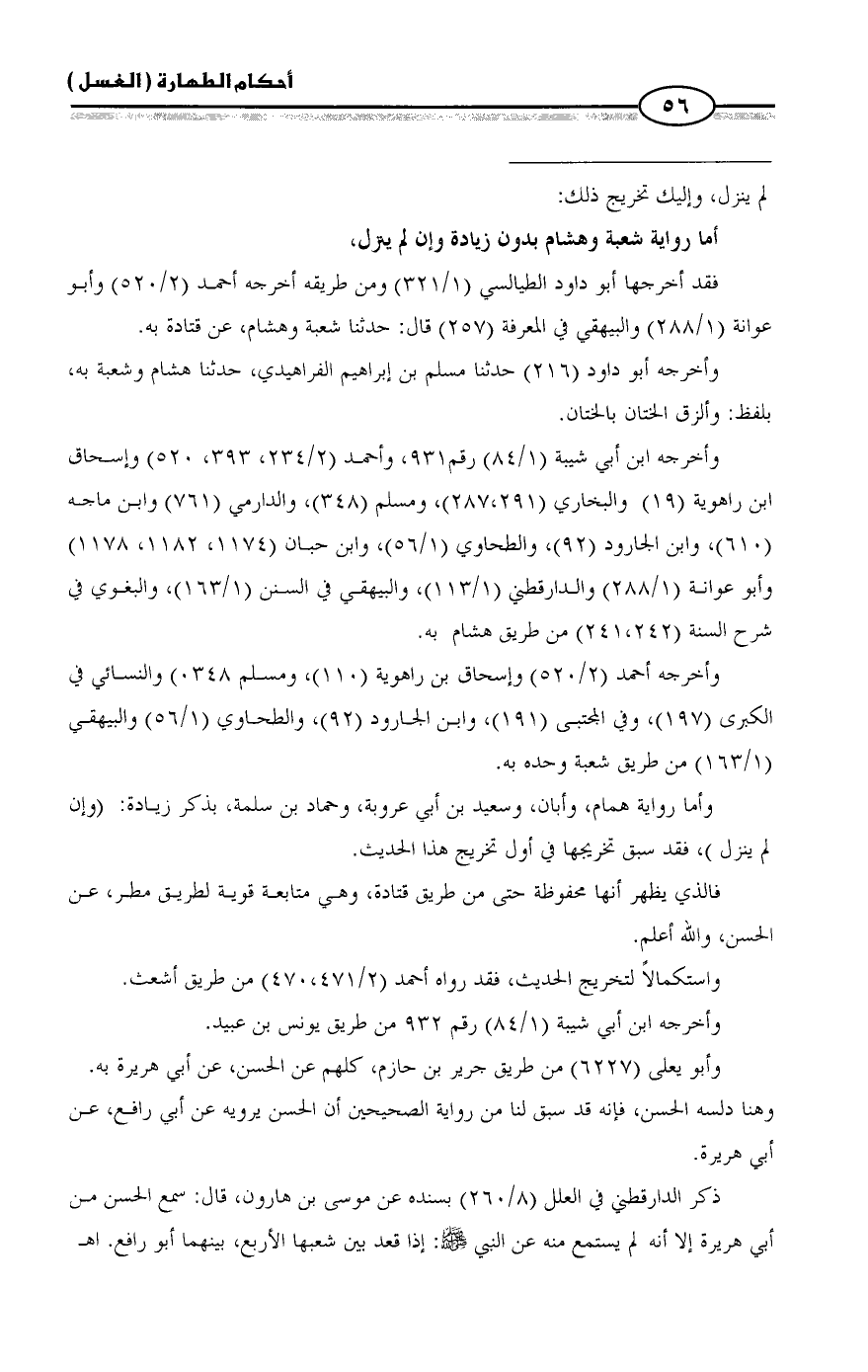 (٦١٠)، وابن الجارود (٩٢)، والطحاوي (١/ ٥٦)، وابن حبان (١١٧٤، ١١٨٢، ١١٧٨) وأبو عوانة (١/ ٢٨٨) والدارقطني (١/ ١١٣)، والبيهقي في السنن (١/ ١٦٣)، والبغوي في شرح السنة (٢٤١،٢٤٢) من طريق هشام به.
