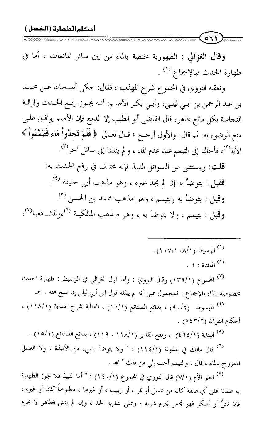 (¬٣) المجموع (١/ ١٣٩) وقال النووي: وأما قول الغزالي في الوسيط: طهارة الحدث مخصوصة بالماء بالإجماع، فمحمول على أنه لم يبلغه قول ابن أبي ليلى إن صح عنه. اهـ