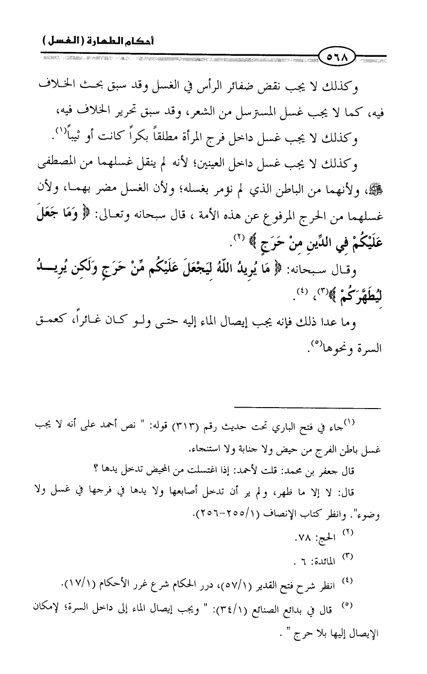 (¬١) جاء في فتح الباري تحت حديث رقم (٣١٣) قوله: " نص أحمد على أنه لا يجب غسل باطن الفرج من حيض ولا جنابة ولا استنجاء.