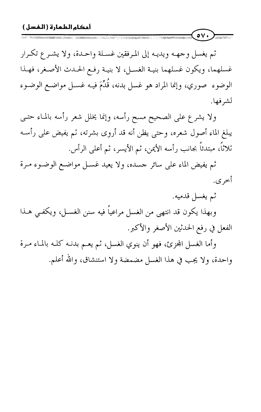 وبهذا يكون قد انتهى من الغسل مراعياً فيه سنن الغسل، ويكفي هذا الفعل في رفع الحدثين الأصغر والأكبر.