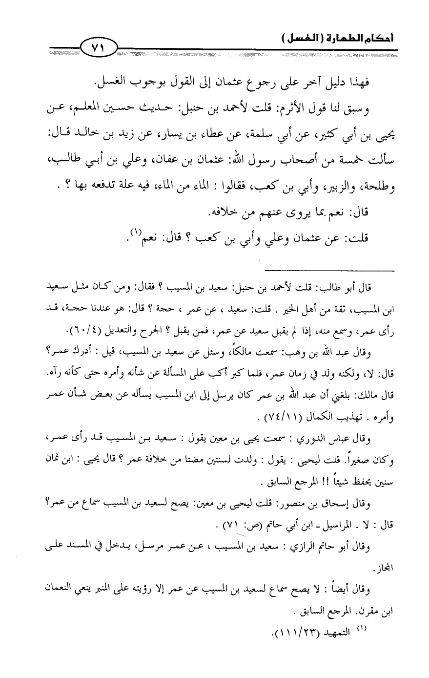 وسبق لنا قول الأثرم: قلت لأحمد بن حنبل: حديث حسين المعلم، عن يحيى بن أبي كثير، عن أبي سلمة، عن عطاء بن يسار، عن زيد بن خالد قال: سألت خمسة من أصحاب رسول الله: عثمان بن عفان، وعلي بن أبي طالب، وطلحة، والزبير، وأبي بن كعب، فقالوا: الماء من الماء، فيه علة تدفعه بها؟.
