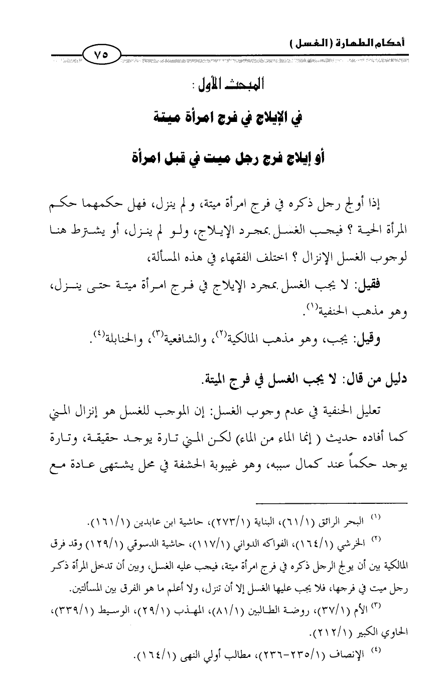 (¬٢) الخرشي (١/ ١٦٤)، الفواكه الدواني (١/ ١١٧)، حاشية الدسوقي (١/ ١٢٩) وقد فرق المالكية بين أن يولج الرجل ذكره في فرج امرأة ميتة، فيجب عليه الغسل، وبين أن تدخل المرأة ذكر رجل ميت في فرجها، فلا يجب عليها الغسل إلا أن تنزل، ولا أعلم ما هو الفرق بين المسألتين.