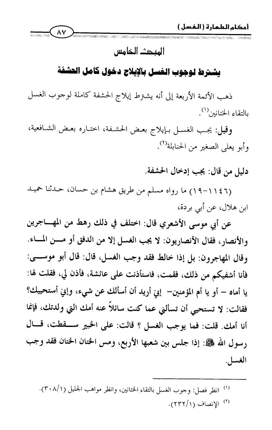 (¬١) انظر فصل: وجوب الغسل بالتقاء الختانين، وانظر مواهب الجليل (١/ ٣٠٨).