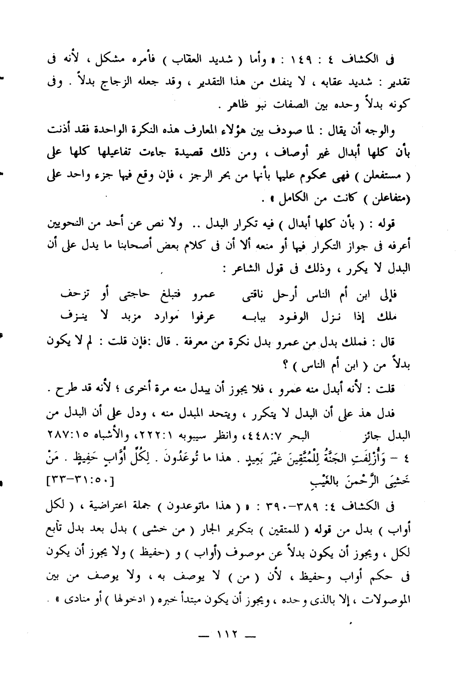 والوجه أن يقال: لما صودف بين هؤلاء المعارف هذه النكرة الواحدة فقد أذنت بأن كلها أبدال غير أوصاف، ومن ذلك قصيدة جاءت تفاعيلها كلها على (مستفعلن) فهي محكوم عليها بأنها من بحر الرجز، فإن وقع فيها جزء واحد على (متفاعلن) كانت من الكامل».