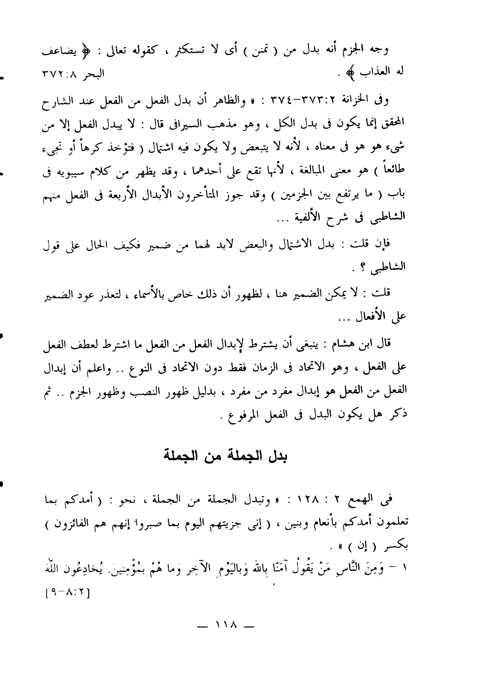 وفي الخزانة 373:2 - 374: «والظاهر أن بدل الفعل من الفعل عند الشارح المحقق إنما يكون في بدل الكل، وهو مذهب السيرافي قال: لا يبدل الفعل إلا من شيء هو هو في معناه، لأنه لا يتبعض ولا يكون فيه اشتمال (فتؤخذ كرهًا أو تجئ طائعًا) هو معنى المبالغة، لأنها تقع على أحدهما، وقد يظهر من كلام سيبويه في باب (ما يرتفع بين الجزمين) وقد جوز المتأخرون الإبدال الأربعة في الفعل منهم الشاطبي في شرح الألفية.