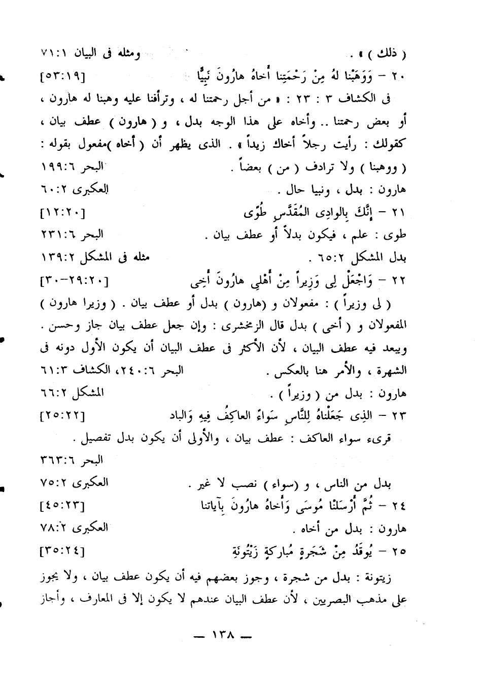 (لي وزيرًا): مفعولان و (هارون) بدل أو عطف بيان. (وزيرًا هارون) المفعولان و (أخي) بدل قال الزمخشري: وإن جعل عطف بيان جاز وحسن. ويبعد فيه عطف البيان، لن الأكثر في عطف البيان أن يكون الأول دونه في الشهرة، والأمر هنا بالعكس. البحر 240:6، الكشاف 61:3