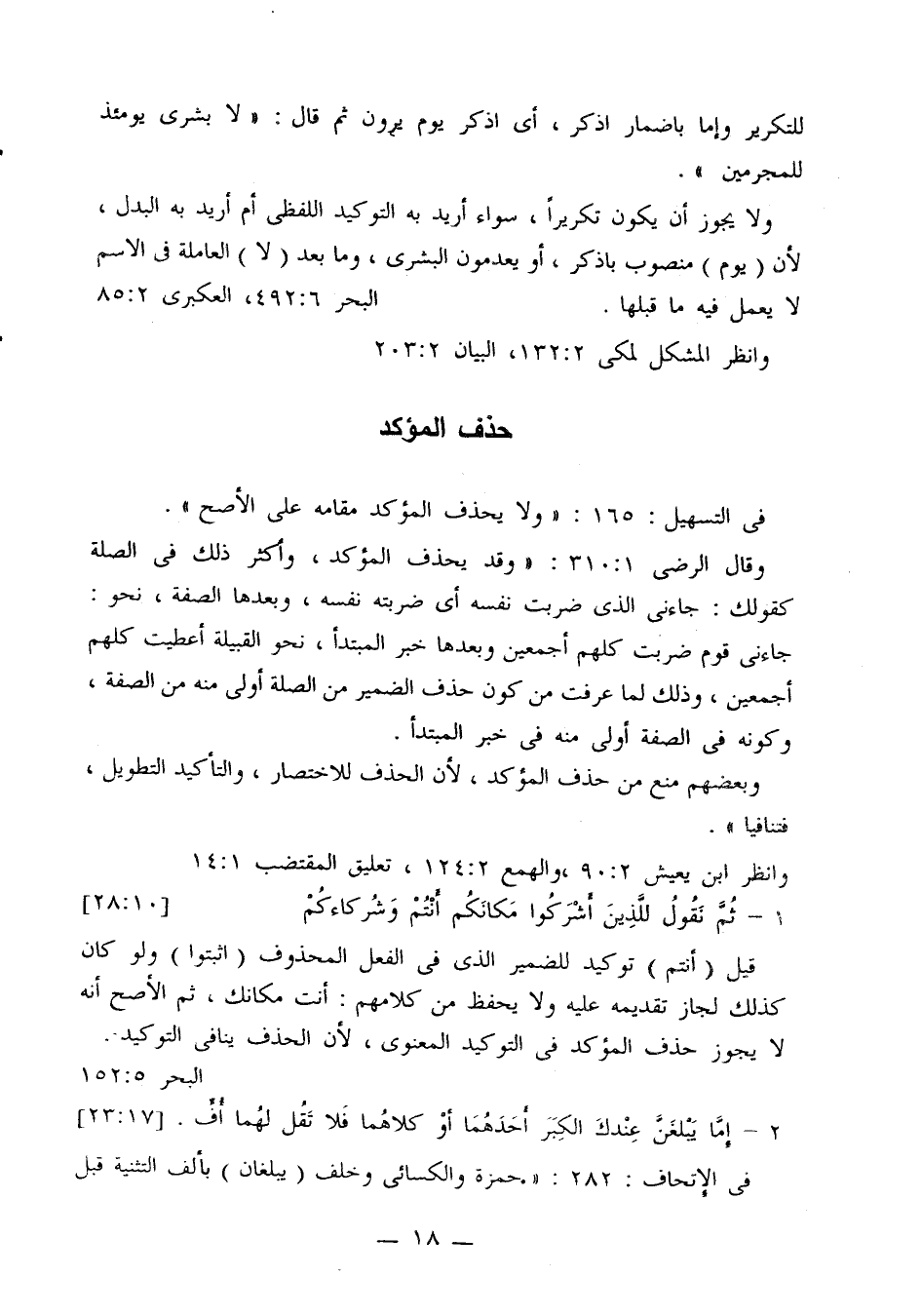 وقال الرضي 310:1: «وقد يحذف المؤكد، وأكثر من ذلك في الصلة كقولك: جاءني الذي ضربت نفسه أي ضربته نفسه، وبعدها الصفة، نحو: كقولك: جاءني قوم ضربت كلهم أجمعين وبعدها خبر المبتدأ، نحو القبيلة أعطيت كلهم أجمعين، وذلك لما عرفت من كون حذف الضمير من الصلة أولى منه من الصفة، وكونه في الصفة أولى منه في خبر المبتدأ.