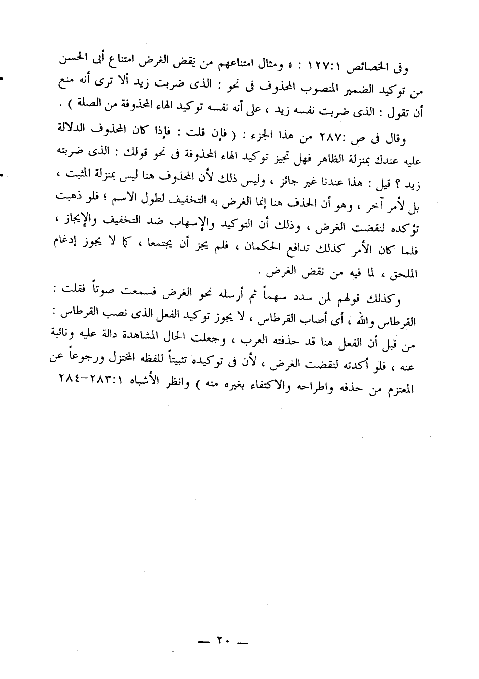 وفي الخصائص 127:1: «ومثال امتناعهم من نقض الغرض امتناع أبي الحسن من توكيد الضمير المنصوب المحذوف في نحو: الذي ضربت زيد ألا ترى أنه منع أن تقول: الذي ضربت نفسه زيد، على أنه نسفه توكيد الهاء المحذوفة من الصلة).