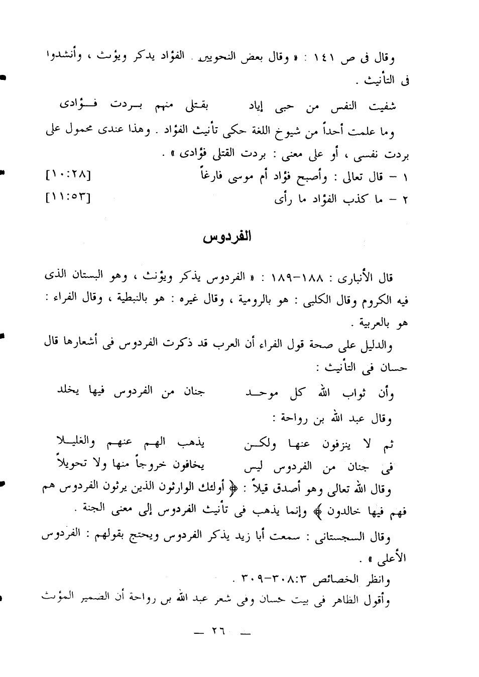 وقال في ص 141: «وقال بعض النحويين: الفؤاد يذكر ويؤنث، وأنشدوا في التأنيث.